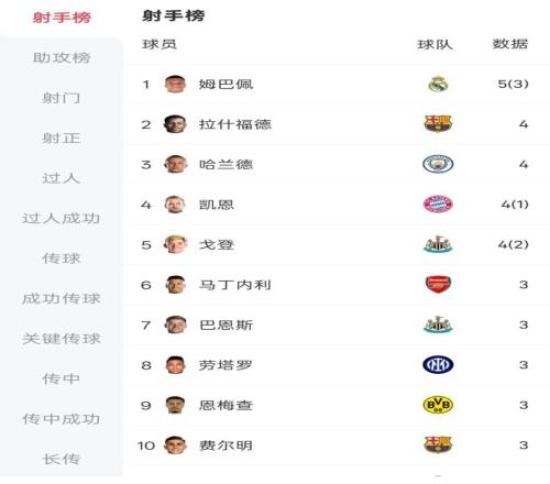 雷速体育10月22日宣 北京时间今日,欧冠单夜九场精彩纷呈的比赛落幕,欧冠的射手榜也有所变动,拉什福德来到了第二,姆巴佩依旧五球居首。