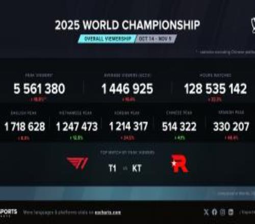 据外媒统计,S15总决赛Bo5的海外直播平台巅峰收视为556万,相比去年S14决赛热度有所下滑。